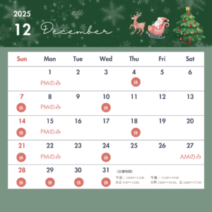 2月の休診日のお知らせ いつもご来院頂きましてありがとうございます。 2月の休診日についてお知らせします。 ・痛みや装置のトラブル等ございましたら当院公式LINEよりご連絡ください。 【初診相談のご予約】はこちらから 【 […]